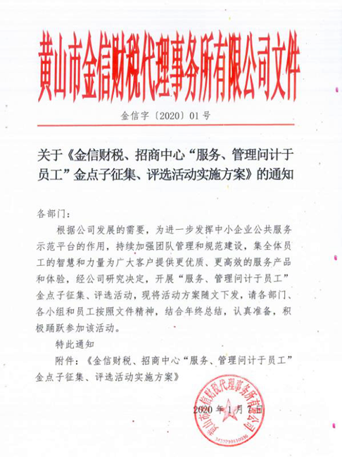 為進一步發(fā)揮“國家中小企業(yè)公共服務示范平臺”的作用,持續(xù)加強團隊管理和規(guī)范建設,集全體員工的智慧和力量為廣大客戶提供更優(yōu)質、更高效的服務產品和體驗,招商中心、金信財稅決定開展“服務、管理問計于員工”金點子征集、評選活動。