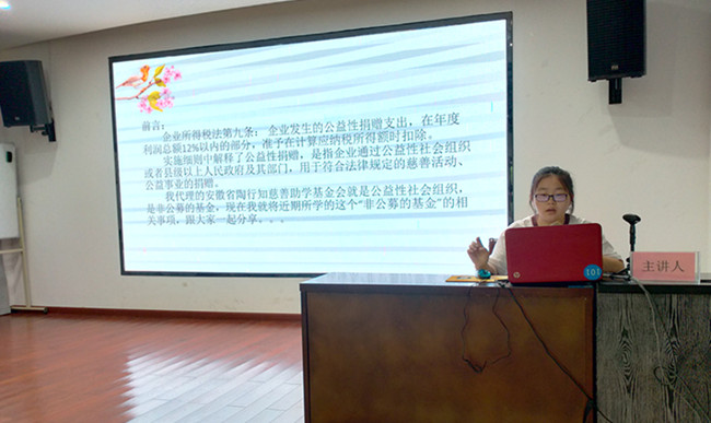 方智敏是一名初級會計師,她工作認真,勤奮好學,善于思考,她結(jié)合自己平時工作中總結(jié)出的工作經(jīng)驗,從非公募基金會支出費用的規(guī)定、公益性捐贈稅前扣除資格審核、民非會計制度賬套的建立等等幾個方面進行詳細介紹。經(jīng)過方智敏的講解,使參與人員對公益性稅前扣除條件和要求有了更深入的了解和認知,對民非賬套制度建立的操作過程更加清晰明了。