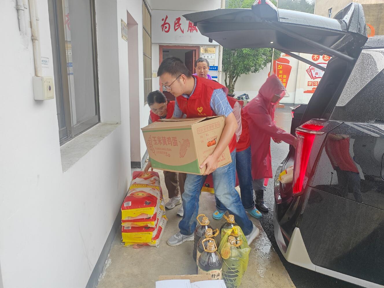 上圖為:采購米、油和雞蛋等生活急需物資送到上豐鄉(xiāng)災(zāi)民安置點