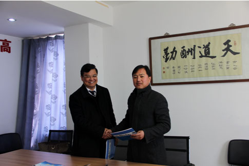 金信財(cái)稅總經(jīng)理胡海鋒與聚瑞公司總經(jīng)理王德瑞握手達(dá)成協(xié)議