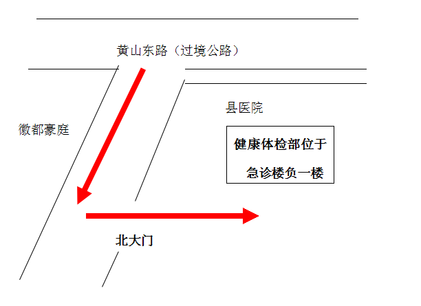 一、健康體檢部位置(線路1:不要上醫(yī)院平臺(tái),沿著縣醫(yī)院與徽都豪庭之間的主干道直行300米左轉(zhuǎn),從北大門進(jìn)入縣醫(yī)院,直行40米到達(dá)健康體檢部;線路2:上醫(yī)院平臺(tái),從一樓門診大廳,沿樓梯下到負(fù)一樓健康體檢部。)